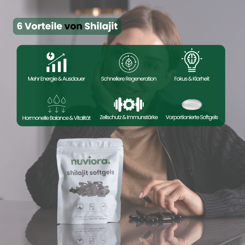 Shilajit ist reich an Fulvinsäuren, Mineralien und Antioxidantien. In der Softgel-Form bleibt diese natürliche Zusammensetzung vollständig erhalten und leidet nicht unter Verarbeitungsmethoden. Das bedeutet: Du bekommst ein Naturprodukt. Die hohe Qualität der Shilajit-Softgels von nuviora. macht sich bemerkbar – jeden Tag, jede Kapsel, jede Einnahme. Du willst es für Dich selbst testen? Dann bestelle Dir noch jetzt eine, zwei oder gleich drei Packungen zum Angebotspreis.