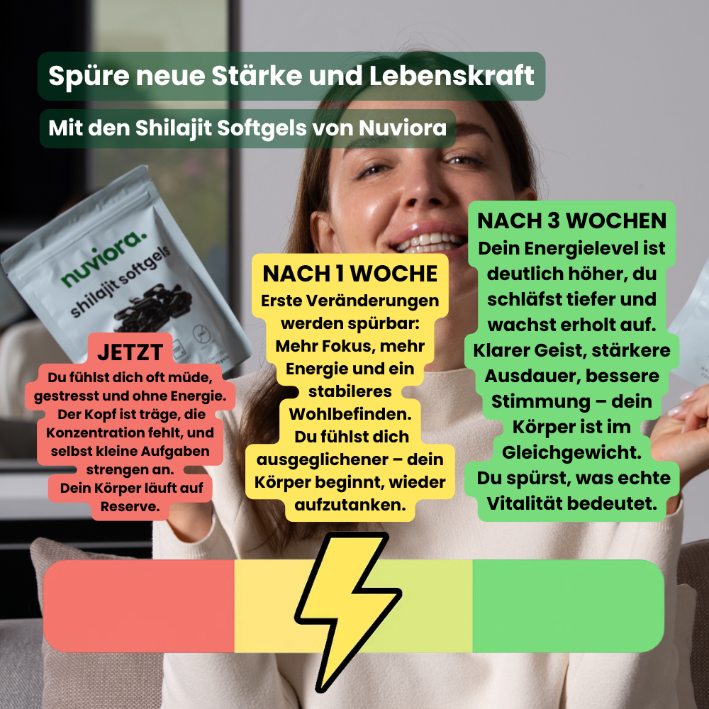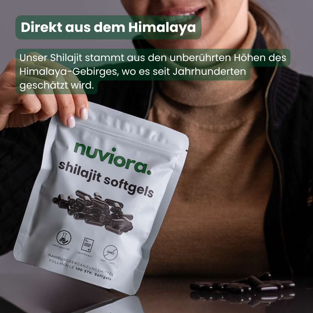 Die nuviora. Shilajit Softgels vereinen reine Himalaya-Kraft mit moderner Anwendung – für spürbare Energie, Fokus und Wohlbefinden im Alltag.