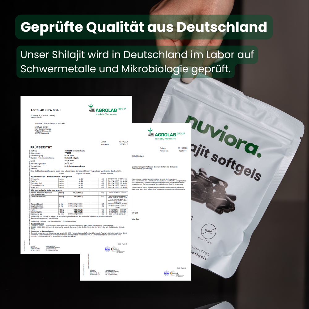 So erhältst du Shilajit in seiner reinsten und sichersten Form. Getestet in Deutschland durch die AGROLAB LUFA GmbH – einem nach DIN EN ISO/IEC 17025 akkreditierten Labor.